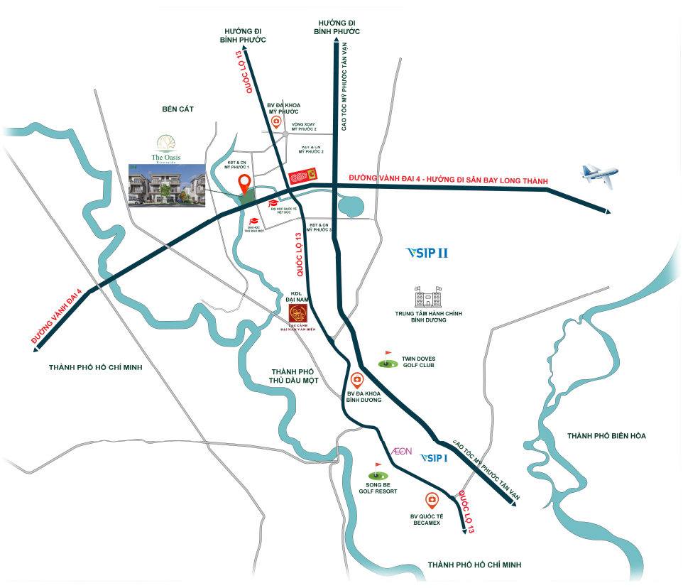 The Oasis Riverside sở hữu vị trí đắc địa trên tuyến Vành Đai 4, kết nối trực tiếp Quốc lộ 13, cao tốc Mỹ Phước – Tân Vạn, và các khu công nghiệp lớn như VSIP, Mỹ Phước, Rạch Bắp.