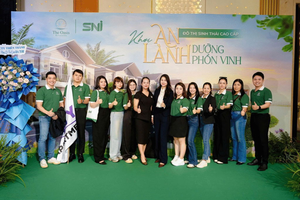 Kết thúc sự kiện: khách mời cùng chụp ảnh lưu niệm, ghi dấu khoảnh khắc khởi đầu lịch sử. The Oasis Riverside – dự án khẳng định cam kết về tiện ích đẳng cấp và tiềm năng đầu tư bền vững. SNI tri ân khách mời và đội ngũ đã trân trọng gửi gắm niềm tin đến dự án và chính thức mở ra hành trình “Khơi An Lành – Dưỡng Phồn Vinh” đầy triển vọng.