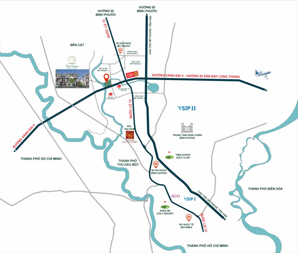 The Oasis Riverside tọa lạc ngay mặt tiền đường Vành đai 4, kết nối trực tiếp Quốc lộ 13 và các trung tâm thương mại, trường học và khu công nghiệp lớn. Khoảng cách thuận tiện: