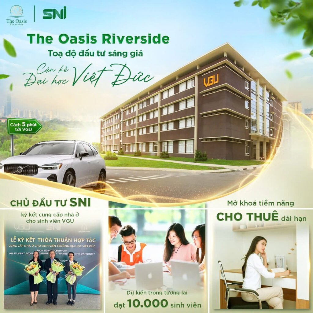 Trong bối cảnh Bến Cát – Bình Dương trở thành trung tâm công nghiệp, sự kiện Chủ đầu tư SNI ký kết hợp tác cung cấp chỗ ở cho Đại học Việt–Đức (VGU) đã mở ra một luận cứ đầu tư vững chắc: The Oasis Riverside không chỉ thu hút khách hàng an cư mà còn sở hữu nguồn cầu thuê bền vững ngay từ khi ra mắt.